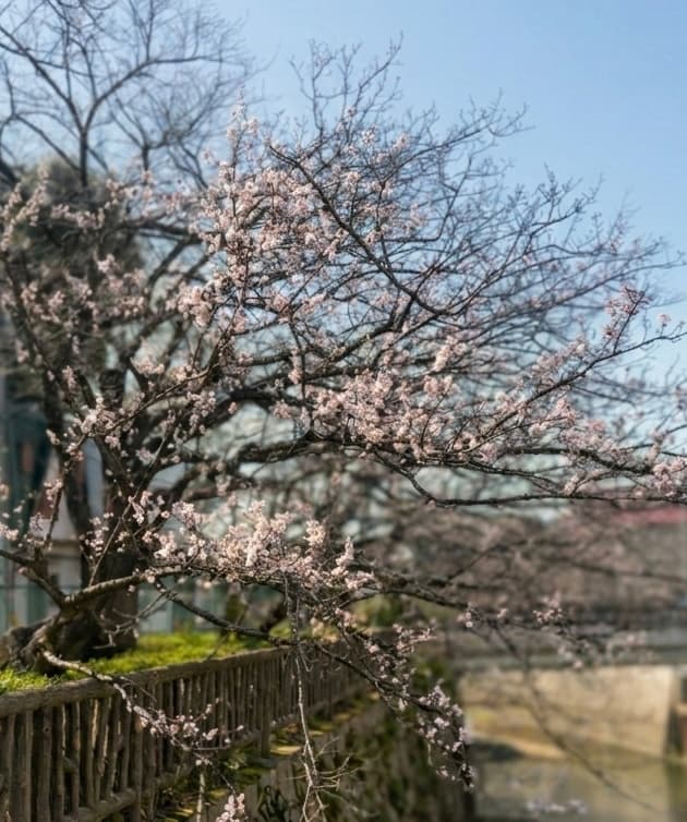 今日 桜の名所でもある川沿いでは、一部の桜がすでに開花しとった